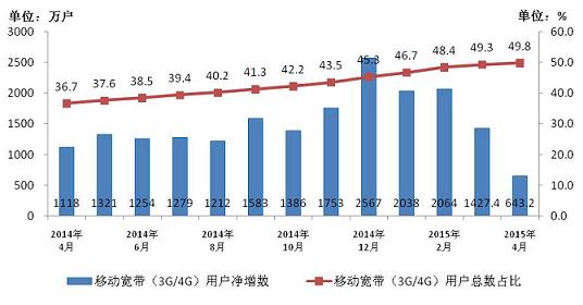 圖2.2014-2015年4月移動(dòng)寬帶用戶當(dāng)月凈增數(shù)和總數(shù)占比情況