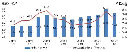 圖4 2014-2015年4月手機(jī)上網(wǎng)用戶和對(duì)移動(dòng)電話用戶滲透率情況