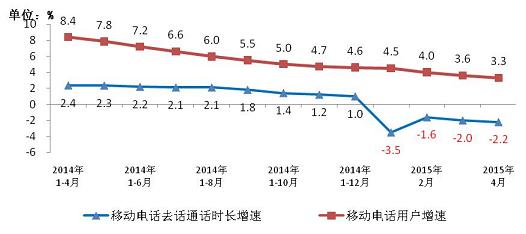 圖5. 2014-2015年4月移動(dòng)電話去話通話量和移動(dòng)電話用戶同比增長(zhǎng)比較