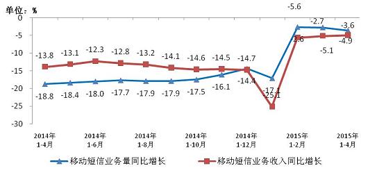 圖6. 2014-2015年4月移動(dòng)短信業(yè)務(wù)量和移動(dòng)短信收入同比增長(zhǎng)情況