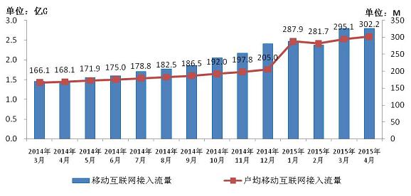 圖7 2014-2015年4月移動(dòng)互聯(lián)網(wǎng)接入流量和戶均流量比較