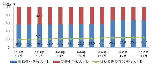 圖9 2014-2105年4月話音、非話音、移動(dòng)數(shù)據(jù)及互聯(lián)網(wǎng)收入占比情況