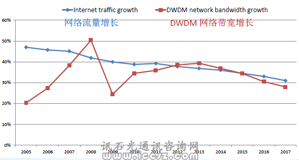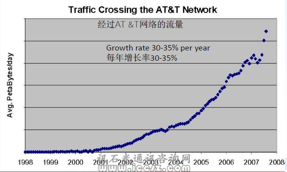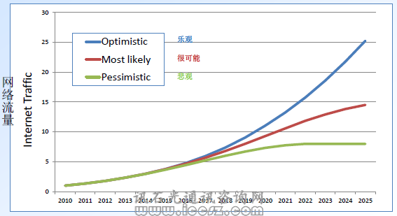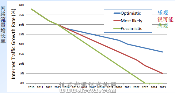 從圖中可以看出,Cisco的預(yù)測(cè)保守得多而貝爾實(shí)驗(yàn)室的預(yù)測(cè)更樂(lè)觀,他們認(rèn)為增長(zhǎng)率放緩的幅度更大。