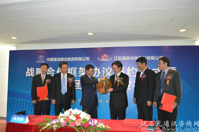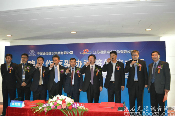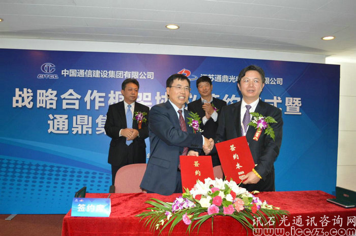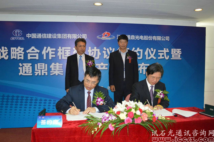 在展覽會(huì)期間,同時(shí)舉行各種論壇,以及各企業(yè)達(dá)成的簽約合作儀式。26日下午,江蘇通鼎光電股份有限公司(以下簡(jiǎn)稱“通鼎”)與中國(guó)通信建設(shè)集團(tuán)有限公司(以下簡(jiǎn)稱“中通建”)就達(dá)成戰(zhàn)略合作框架舉行簽字儀式,同時(shí)舉行新品發(fā)布會(huì)。會(huì)議主要由七大流程組成,首先是通鼎集團(tuán)新產(chǎn)品介紹,然后是中通建總經(jīng)理致辭講話,緊接著通鼎董事長(zhǎng)為簽約合作會(huì)議致辭講話,然后來到會(huì)議最重要部分,在大會(huì)來賓與媒體朋友的見證下通鼎與中通建簽署戰(zhàn)略合作框架協(xié)議!協(xié)議簽署完成之后,簽約雙方簽署產(chǎn)品贈(zèng)送協(xié)議,最后互換禮品以及合影慶祝!