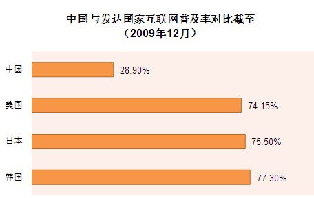 從普及率來(lái)看,數(shù)據(jù)顯示,中國(guó)的互聯(lián)網(wǎng)普及率達(dá)到28.9%,高于25.6%的世界平均水平。但與發(fā)達(dá)國(guó)家相比,還存在較大的差距。據(jù)中國(guó)互聯(lián)網(wǎng)絡(luò)信息中心報(bào)告顯示,截至2009年12月,美國(guó)、日本和韓國(guó)的互聯(lián)網(wǎng)普及率分別達(dá)到74.1%,75.5%和77.3%。