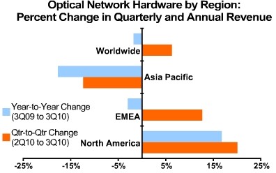 2010年三季度,以WDM設(shè)備市場(chǎng)收入穩(wěn)定增長(zhǎng)為主導(dǎo),全球光網(wǎng)絡(luò)硬件市場(chǎng)收入環(huán)比增長(zhǎng)6.2%,達(dá)到32.3億美元。