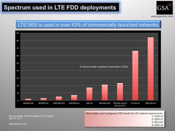 大多數(shù)運(yùn)營(yíng)商部署FDD模式的LTE標(biāo)準(zhǔn)。最廣泛使用的頻帶仍然是1800 MHz(band 3),占已推出商業(yè)LTE FDD網(wǎng)絡(luò)的43%以上;下一個(gè)主流是2.6 GHz(band 7),占已推出LTE FDD網(wǎng)絡(luò)的34%;其次是800 MHz(band 20),占比為11%;緊隨其后的為AWS(band 4),占比約為9%。