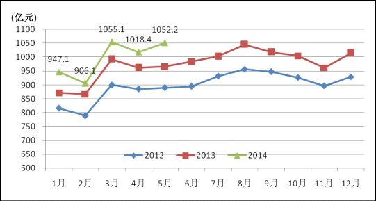 圖1. 2012-2014年各月電信主營(yíng)業(yè)務(wù)收入比較
