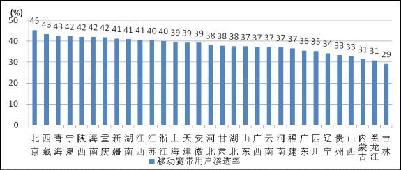 5月,東、中、西部地區(qū)移動(dòng)寬帶用戶分別比上年末凈增3338.3、1826.8、1894.7萬(wàn)戶,東部地區(qū)凈增用戶占比達(dá)47.3%。東中西部地區(qū)移動(dòng)寬帶用戶普及情況差異不大,東部地區(qū)移動(dòng)寬帶用戶滲透率最高,達(dá)38.2%,分別比中西部地區(qū)高1.5、0.7個(gè)百分點(diǎn)。各省之間移動(dòng)寬帶用戶滲透率差異較小,滲透率高于40%的省份超過(guò)三分之一,其中北京全國(guó)最高,達(dá)到45.2%,吉林滲透率不足30%,僅為29.2%。