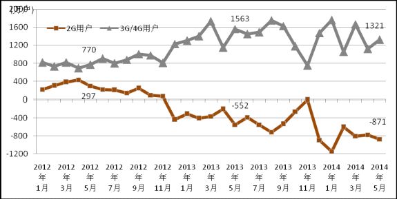 圖2. 2012-2014年2G用戶和3G/4G用戶當(dāng)月凈增比較