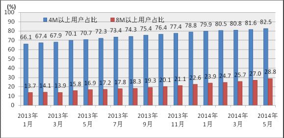 圖3. 2013-2014年互聯(lián)網(wǎng)寬帶接入8M以上用戶占比情況