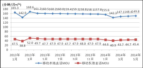 圖5. 2013-2014年移動(dòng)本地和長(zhǎng)途去話MOU值各月比較
