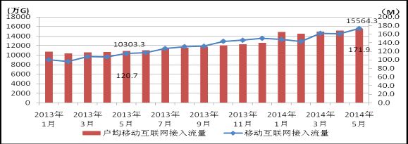 圖7. 2013-2014年各月移動(dòng)互聯(lián)網(wǎng)接入流量和戶均流量比較