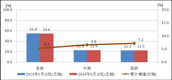 圖9. 2014年5月東、中、西部電信主營(yíng)業(yè)務(wù)收入同期比較