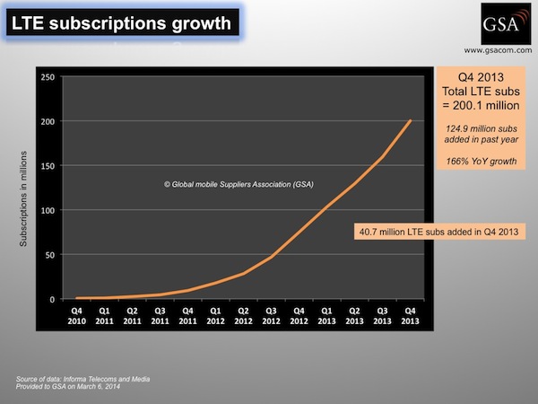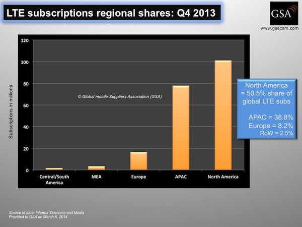 ICCSZ訊 2014年3月10日,GSA(全球移動設(shè)備供應(yīng)商協(xié)會)稱,截至2013年12月31日北美地區(qū)LTE用戶數(shù)達(dá)到1.01億戶,占全球總額2.001億戶的50.5%。