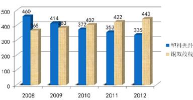 國(guó)內(nèi)FTTH產(chǎn)業(yè)的發(fā)展,面臨進(jìn)一步降低成本的壓力,其中接入線(xiàn)纜占FTTH實(shí)施成本的25%-30%。國(guó)內(nèi)的FTTH接入,多采用烽火科技提出的FTTB+LAN方案,光纖只布設(shè)到樓宇,而樓宇內(nèi)部仍采用傳統(tǒng)的雙絞線(xiàn),雙絞線(xiàn)的原材料是銅,隨著國(guó)際銅價(jià)一路上揚(yáng),“光進(jìn)銅退”成為必然趨勢(shì)。塑料光纖(POF)產(chǎn)業(yè)已經(jīng)發(fā)展多年而市場(chǎng)規(guī)模仍然有限,如今在國(guó)內(nèi)FTTH應(yīng)用中發(fā)現(xiàn)了自己的機(jī)遇(國(guó)外的FTTH一般是光纖到每戶(hù),塑料光纖機(jī)會(huì)很少),正在努力把自己打造成室內(nèi)銅纜的替代品。