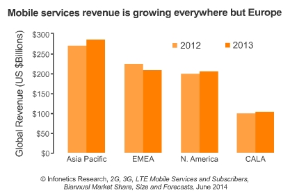 該報(bào)告指出,在2013年,全球移動(dòng)運(yùn)營(yíng)商收入為8000億美元——包括移動(dòng)語(yǔ)音、短信/彩信和寬帶——相比去年增長(zhǎng)1%。全球不同地區(qū)的發(fā)展情況有所不同,亞太地區(qū)(+5%)、加勒比海地區(qū)和拉丁美洲(+4%)和北美(3%),而這些區(qū)域的增長(zhǎng)恰好抵消了EMEA地區(qū)的高位下滑。