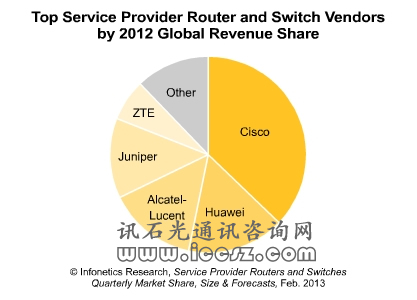 就路由器的市場(chǎng)份額而言,思科在2012年繼續(xù)保持榜首的位置,不過華為和阿爾卡特朗訊在2012年第四季度相關(guān)收入大增之后市場(chǎng)份額也隨之?dāng)U大。