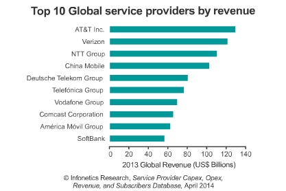 根據(jù)營(yíng)收排名,2013年全球十大服務(wù)供應(yīng)商分別是:AT&T、Verizon、NTT集團(tuán)、中國(guó)移動(dòng)、德國(guó)電信集團(tuán)、西班牙電信集團(tuán)、沃達(dá)豐集團(tuán)、Comcast、America Movil集團(tuán)和日本軟銀。