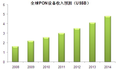 而從2009全年來看,全球PON設備收入達到21.8億美元,與2008年底相比增長35%,預計到2014年將增長一倍多。