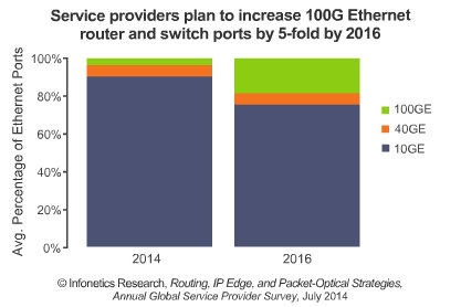 *電信業(yè)正走向100G:在2014年采購10/40/100GE路由器和運營商以太網(wǎng)交換機中有4%是100GE,到2016年預(yù)計將增長接近5倍,到達19%。