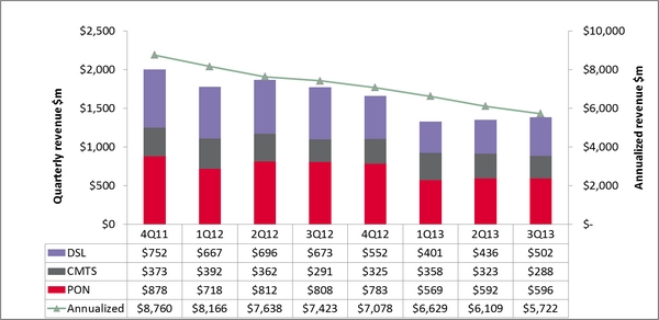 ICCSZ訊(編譯:Nina)來自O(shè)vum的調(diào)查報(bào)告顯示,3Q13全球有線寬帶接入設(shè)備銷售收入環(huán)比增長3%,但同比卻下滑22%,而且截至3Q13的四個(gè)季度的全球有線寬帶接入設(shè)備銷售收入則是自2009年以來首次下滑到60億美元以下。另一方面,PON OLT端口和VDSL端口出貨量同環(huán)比都在增長。此外,CMTS銷售收入在下滑,但思科在該領(lǐng)域則實(shí)現(xiàn)了17%的環(huán)比增長。