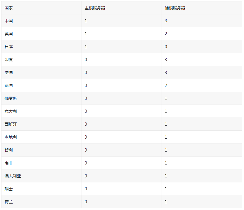 目前全球有 13 個 IPv4 根服務(wù)器,1 個為主根服務(wù)器在美國,其余 12 個均為輔根服務(wù)器,其中 9 個在美國,3 個分別在英國、瑞典和日本。
