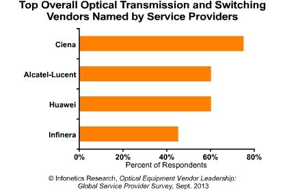 Infonetics光學(xué)首席分析師Andrew Schmitt:“我們最新的研究報(bào)告給我們呈現(xiàn)一張圖表——在光分組設(shè)備,誰是服務(wù)供應(yīng)商眼中的領(lǐng)導(dǎo)者。在我們的調(diào)查得票率中,Ciena、阿朗、思科和華為高居前列。 ”