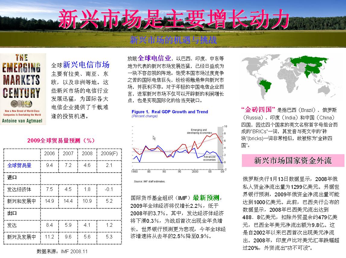 隨著電信業(yè)的迅速發(fā)展,歐美等國家和地區(qū)的電信市場已經(jīng)趨于飽和,電信業(yè)務收入增長乏力。在此情況下,歐美電信巨頭紛紛將目光投向潛力巨大的新興市場,期望電信業(yè)蓬勃發(fā)展的這塊市場能緩解本土市場收入、利潤增長雙乏力的壓力。