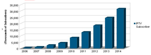 由政府推動各家電信、廣播和互聯(lián)網(wǎng)運營商加快覆蓋速度,中國網(wǎng)絡(luò)電視(IPTV)用戶將在未來幾年繼續(xù)快速增長。