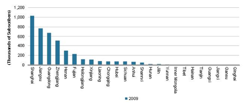 2009年中國IPTV用戶區(qū)域分布圖: