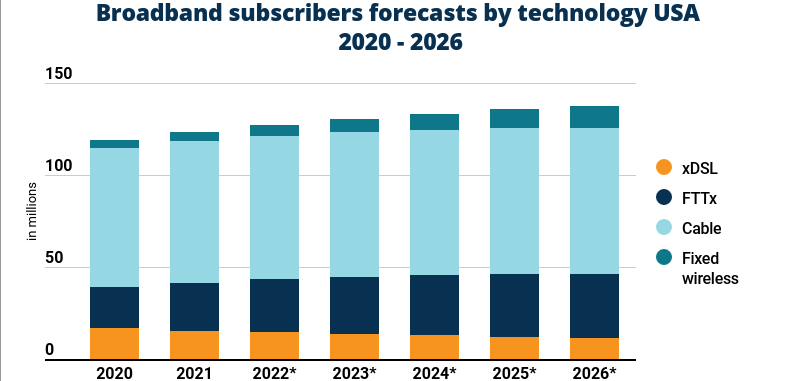 ICC訊 Dataxis的研究顯示,到2026年,美國(guó)家庭寬帶普及率將達(dá)到近100%的,盡管該市場(chǎng)歷來(lái)由有線運(yùn)營(yíng)商主導(dǎo),但光纖網(wǎng)絡(luò)將在該行業(yè)增長(zhǎng)中發(fā)揮最重要的作用。