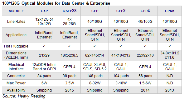 為數(shù)據(jù)中心和企業(yè)網(wǎng)絡(luò)提供更具成本效益的40G和100G解決方案的QSFP+/CXP光模塊和有源光纜廠商越來越多。目前,光模塊廠商都推出了第一款CFP2模塊,許多網(wǎng)絡(luò)設(shè)備制造商都采用了這種封裝模式,而少數(shù)在等待CFP4。思科則是逆主流而行,使用其專有的CPAK模塊。對(duì)于100G,長(zhǎng)途設(shè)備制造商們正在使用in-house設(shè)計(jì)或OIF 168-pin模塊。