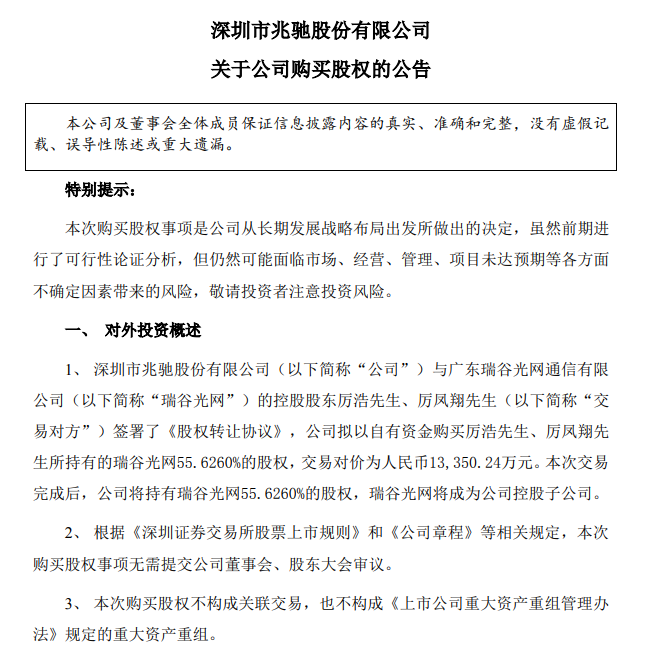 根據(jù)公告,兆馳股份與瑞谷光網(wǎng)的控股股東厲浩先生、厲鳳翔先生簽署了《股權(quán)轉(zhuǎn)讓協(xié)議》,公司擬以自有資金購買厲浩先生、厲鳳翔先生所持有的瑞谷光網(wǎng)55.6260%的股權(quán),交易對價(jià)為人民幣13,350.24萬元。