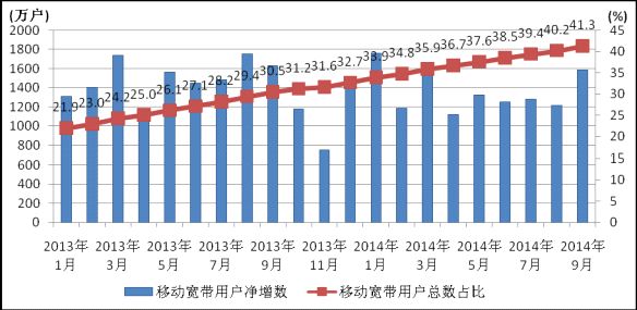 圖2.2013-2014年移動寬帶用戶當(dāng)月凈增數(shù)和總數(shù)占比情況