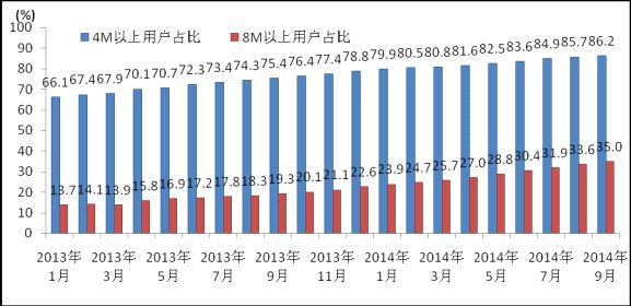 圖3 2013-2014年9月互聯(lián)網(wǎng)寬帶接入速率4M和8M以上用戶占比情況