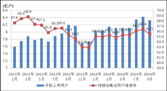 圖4 2013-2014年手機上網(wǎng)用戶和對移動電話用戶滲透率情況
