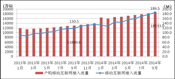 圖7. 2013-2014年各月移動互聯(lián)網(wǎng)接入流量和戶均流量比較