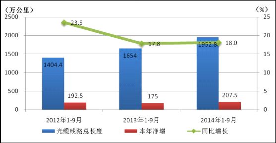 圖12 2012-2014年1-9月光纜線路總長度發(fā)展情況