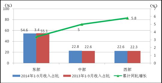 圖13 2014年9月東、中、西部電信主營業(yè)務(wù)收入同期比較