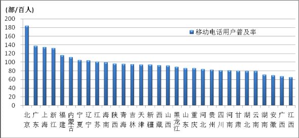 9月,東、中、西部地區(qū)移動電話普及率分別達(dá)到111.5、78.1、84部/百人,分別比上年末提高1.7、4.4、4部/百人,中部地區(qū)普及率提升明顯。東部與中西部的移動電話普及率差距小幅收窄,各地區(qū)之間差距依然明顯。全國共9省市移動電話普及率超過100部/百人,其中7省市集中在東部地區(qū)。北京市移動電話普及率高達(dá)183.8部/百人,比上年末提高24.3部/百人。遼寧、廣東、新疆等3省市的移動電話普及率比上年末出現(xiàn)下降,移動電話用戶數(shù)的“天花板效應(yīng)”日益凸顯。