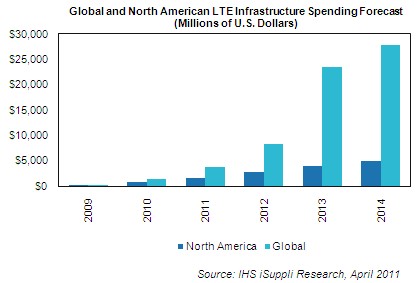【訊石光通訊咨詢網(wǎng)】2011年,美國和歐洲許多運營商開始大規(guī)模部署LTE無線基礎設施,以應對未來三年無線網(wǎng)絡向4G遷移。據(jù)IHS iSuppli公司調(diào)查分析,2011年全球LTE基礎設備開支規(guī)模將從2010年的15億美金上升到38億美金,到2014年將達到279億美金,年復合增長率在107.5%。
