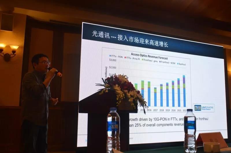 Azuri Optics的CEO李文博士發(fā)表了以《千兆接入及5G時(shí)代展望光芯片技術(shù)》為主題的演講報(bào)告,他通過引用數(shù)據(jù)指出光通訊接入市場將迎來高速增長,接入網(wǎng)處于新舊技術(shù)更新期,5G大戲即將拉開帷幕,這給光芯片尤其是激光器發(fā)射芯片帶來機(jī)會(huì)和挑戰(zhàn),高速、大功率、可調(diào)諧激光器為發(fā)展趨勢。