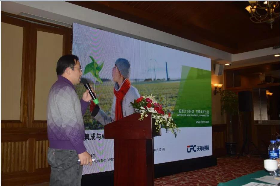 之后,蘇宿工業(yè)園招商局局長陳翔向大家介紹了蘇州宿遷工業(yè)園的情況。天孚通信研發(fā)副總監(jiān)張鐵軍就《混合集成與AWG(陣列波導(dǎo)光柵)的應(yīng)用》發(fā)表了精彩報(bào)告。報(bào)告首先介紹了硅光發(fā)展現(xiàn)狀,提出了硅光面臨突破的兩大技術(shù)問題:一是芯片良率低,成本優(yōu)勢不明顯。二是硅波導(dǎo)與光纖的耦合效率低,性能優(yōu)勢不明顯。然后闡述了AWG集成光器件的優(yōu)勢與應(yīng)用,重點(diǎn)給大家介紹了天孚通信幾款A(yù)WG相關(guān)產(chǎn)品Receptacle with AWG-Demux和AWG-Mux產(chǎn)品、混合集成的無源和有源拓展產(chǎn)品BOX封裝、有源COC、Lan-wdm Mux/Demux等產(chǎn)品。TFC AWG產(chǎn)品貼片能力強(qiáng),激光精準(zhǔn)控溫,貼片精度高,可實(shí)現(xiàn)共晶焊、點(diǎn)膠、倒貼片工藝,所有產(chǎn)品實(shí)際位置均有數(shù)據(jù)記錄,便于追溯分析。