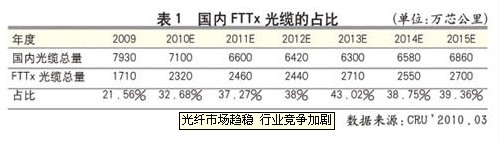 CRU還預(yù)測中國2010年、2011年、2012年、2013年、2014年、2015年光纜總的需求量分別為7100萬芯公里、6600萬芯公里、6420萬芯公里、6300萬芯公里、6580萬芯公里、6860萬芯公里,預(yù)測中國2010年、2011年、2012年、2013年、2014年、2015年應(yīng)用于FTTx的光纜需求量分別為2320萬芯公里、2460萬芯公里、2440萬芯公里、2710萬芯公里、2550萬芯公里、2700萬芯公里。從表1可以看到,盡管國內(nèi)光纜需求在2009年“爆發(fā)”以后,有一個消化的過程,但FTTx的占比呈增長態(tài)勢。因此,烽火通信堅定看好FTTx光纜市場發(fā)展。