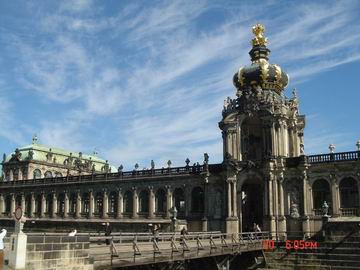 |     在熱情的當(dāng)?shù)厝说闹敢?,我們順利的來到了此行目的地也是德累斯頓的象征--茨溫格宮(Zwinger)。蜿蜒的護(hù)城河外,綠樹成蔭。茨溫格宮是18世紀(jì)薩克森國王奧古斯特二世下令建筑師丹尼爾·佩曼主持修建的一座巴洛克式建筑,茨溫格宮因建在茨溫格花園上而得名。茨溫格宮被認(rèn)為是最漂亮的巴洛克建筑,同時(shí)也是歐洲后巴洛克風(fēng)格最重要的建筑之一。 從護(hù)城河外遙望茨溫格宮,最引人注目的就是那富麗堂皇的王冠門頂冠。王冠門(Kronentor)已成為德累斯頓的城市標(biāo)志之一,它那體現(xiàn)國王威嚴(yán)的金色標(biāo)志由四個(gè)波蘭雄鷹肩負(fù)著。雕塑家佩莫澤爾(Permoser)在王冠門的壁龕中向人們象征性地描繪了一年的四個(gè)季節(jié)。  |
