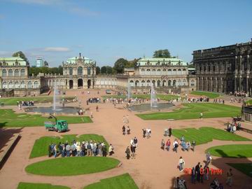 | 通過王冠門,眼前一亮,入目即是茨溫格宮寬闊的內(nèi)庭園。一個(gè)和諧的單層弧形游廊將四周的角亭、圍壁亭(Wallpavillion)、王冠門以及幾個(gè)收藏館連接起來,圍成一個(gè)廣場(chǎng)。在這個(gè)曾經(jīng)被用來當(dāng)作露天的宴慶大廳和娛樂舞臺(tái)的廣場(chǎng)上,游人們或三兩成群拍照留戀,或集體聆聽導(dǎo)游的講解,或在噴水池旁享受陽光,靜靜感受歷史的沉淀,重溫往日的輝煌。登上弧形游廊,向內(nèi)觀望,內(nèi)庭園景色盡在眼底。向外遠(yuǎn)處眺望,可以欣賞風(fēng)姿各異的歐式建筑。 | |
