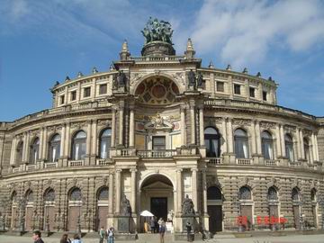 |     劇院帶門形窗戶和弧形門廳的正面朝向廣場(chǎng)的中心,其上層的雙圓柱使整個(gè)建筑顯得和諧而有致。劇院的中部突顯著凱旋門式的中央門廳,門廳兩旁矗立著德國著名詩人歌德(Goethe)和席勒(Schiller)的塑像。劇院頂層是向內(nèi)縮進(jìn)的,正面的窗戶排列整齊利落。 欣賞完歌劇院,繼續(xù)朝著廣場(chǎng)的南面而去,則來到了易北河邊。一行人沿著易北河上的奧古斯圖斯橋緩緩而行,向前望岸邊的茵茵草坪和迷人的孔橋流水,回頭則可遠(yuǎn)觀森伯歌劇院及旁邊的天主教宮廷教堂。  |