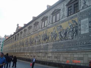 |     從橋上往回走,繞過天主教宮廷教堂,沿著王宮長(zhǎng)廊外墻而行,左邊是林林總總的紀(jì)念品售賣小攤,右邊則是王隊(duì)陣列圖,它是用邁森瓷磚拼成的大型馬賽克紀(jì)念碑,描述的是韋廷家族的王侯們。1873-1876年,畫家威廉瓦爾特(Wilhelm Walter)創(chuàng)作的是102米長(zhǎng)的灰泥刮畫。在早期發(fā)生的建筑損壞越來越明顯之后,人們于1906年將這副巨畫制作在了24,000塊邁森瓷磚上。后來,它受住了1945年的夜間空襲。壁畫共描繪了35位騎馬的邊疆總督、選帝侯和國王,在這些顯貴之間或之后,即是所謂的“步民”,如:傳令官、衛(wèi)兵、旗手等。 看完壁畫,大家沿著石磚路漫步回到了起點(diǎn)。時(shí)間匆忙,許多景點(diǎn)只是走馬觀花一督,甚為遺憾。在德累斯頓,除了我們匆匆走過的老城,在重建后的新城,還有著名的巴洛克式教堂三王教堂、阿爾伯特廣場(chǎng)、國王大街以及狩獵宮等等。只是希望,有朝一日還有機(jī)會(huì)可以“故地重游”。  |