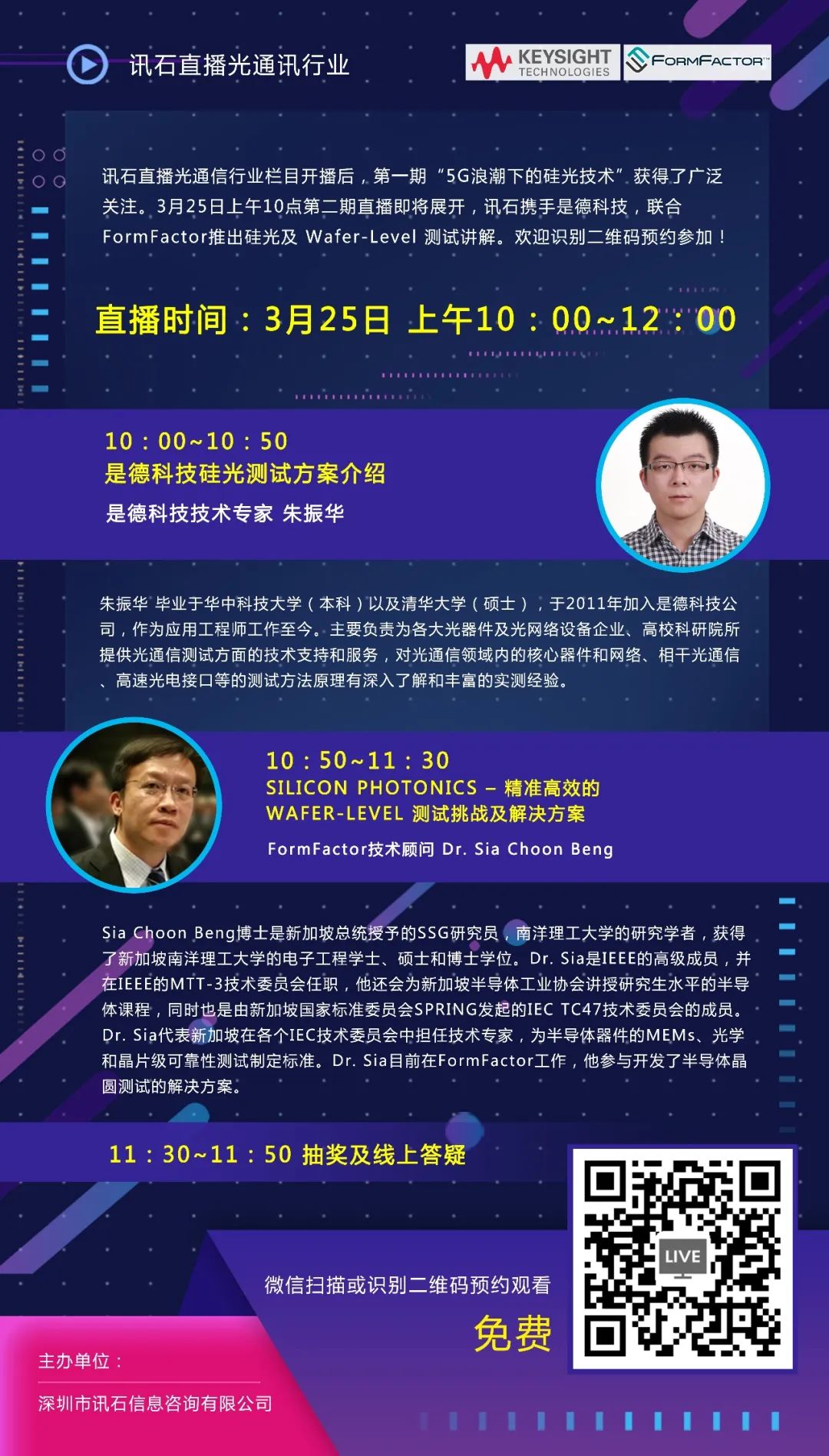 ICCSZ訊 訊石直播光通信行業(yè)欄目開播后,第一期“5G浪潮下的硅光技術(shù)”獲得了廣泛關(guān)注。3月25日上午10點(diǎn)第二期直播即將展開,訊石攜手是德科技,聯(lián)合FormFactor推出硅光及Wafer-Level測試講解。本次直播榮幸邀請到了是德科技測試專家朱振華聯(lián)合FormFactor技術(shù)顧問Sia Choon Beng博士直播關(guān)于硅光測試發(fā)展概況和精準(zhǔn)高效的Wafer-Level測試挑戰(zhàn)及解決方案。歡迎識別二維碼預(yù)約參加!